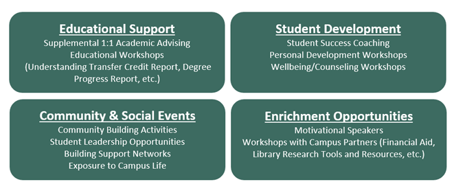 - Provide workshops that are key in helping transfer students become more familiar with their transfer credit report, degree progress report, financial aid package, and professional skills development.