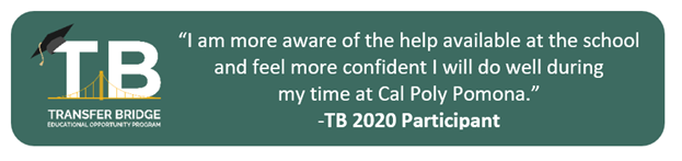 The mission of Transfer Bridge is to provide a wide range of educational, personal, social, and cultural enrichment opportunities prior to their first term of enrollment. Understanding that EOP transfer students come to CPP with unique lived experience and a wealth of knowledge and skill sets, transitioning to a new college environment can still be intimidating. Building on an asset-based framework, TB has evolved to assist students in addressing their resiliency and unique needs, as non-traditional students who juggle multiple responsibilities and often, work full-time. In just three days, students are provided with campus resources, community connections, and additional support services that enhance their skills and success.