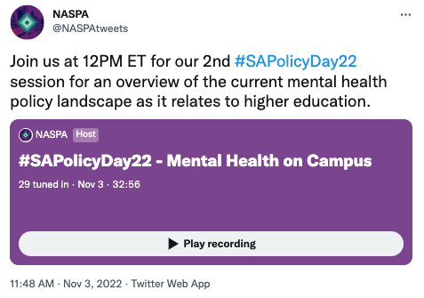 This session provides an overview of the current mental health policy landscape as it relates to higher education, and then dive deeper into access concerns and some of the non-clinical and clinical interventions available on campus. The session will discuss advocacy options and will hold time to answer questions submitted through the Twitter thread connected to the Space.