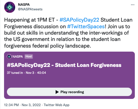 The sessions throughout the day were shared through Twitter Spaces. This program is the first of its kind by NASPA. The free event was held from 11am-4pm EST. By using Twitter Spaces the information shared that day can be accessed through NASPA’s Twitter account @NASPAtweets for anyone interested in listening again. The platform also allowed participants to ask questions in real time and for links to resources to be shared. Below is an overview of what the engaging day looked like with links to the Twitter Spaces sessions.