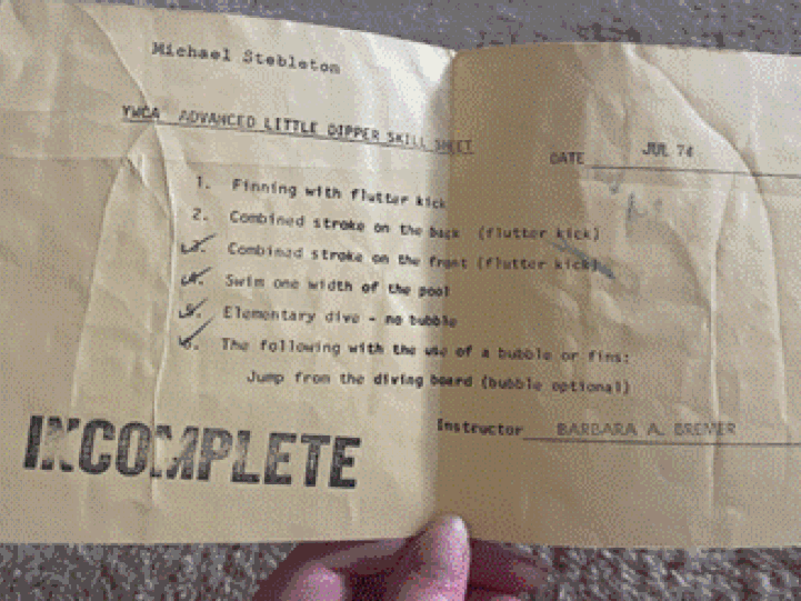 I included the image of this official YWCA swim report card above. My final evaluation for the Advanced Little Dipper class was “INCOMPLETE,” stampe