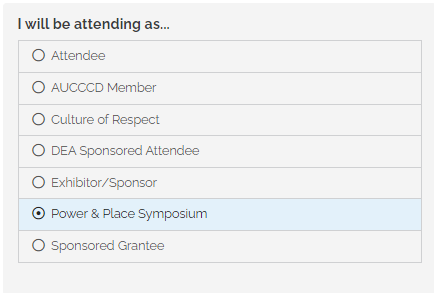 - Then in the "I'm Attending As.." page choose "Power & Place Symposium" (see below)