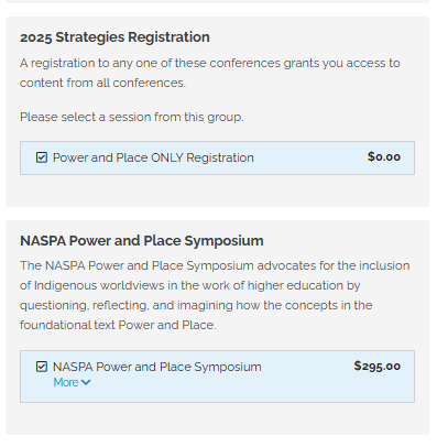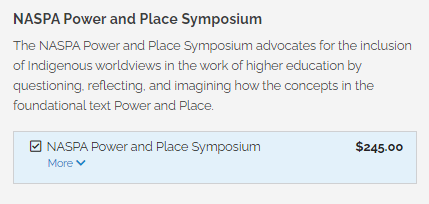 - On the next page choose which conference to attend under then choose the "NASPA Power and Place Symposium" option (see below)
