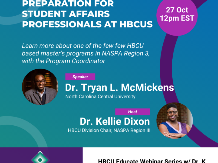 HBCUs continue to have an important contribution to higher education, especially in Region III where nearly 75% of our nation's HBCU institutions are located. In recent years, Region III has made a commitment to better serve these important colleges and universities and continues to explore ways to center the work of professionals at HBCU institutions in our conversations as a region and within the field of Student Affairs. This webinar series is an important part of our commitment.