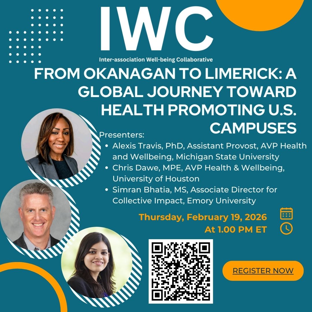 As the Inter-association Well-being Collaborative (IWC) moves from commitment to implementation, we are proud to launch a dynamic webinar series designed to equip higher education professionals and association staff with tools to embed well-being into campus systems and structures.