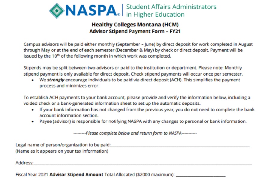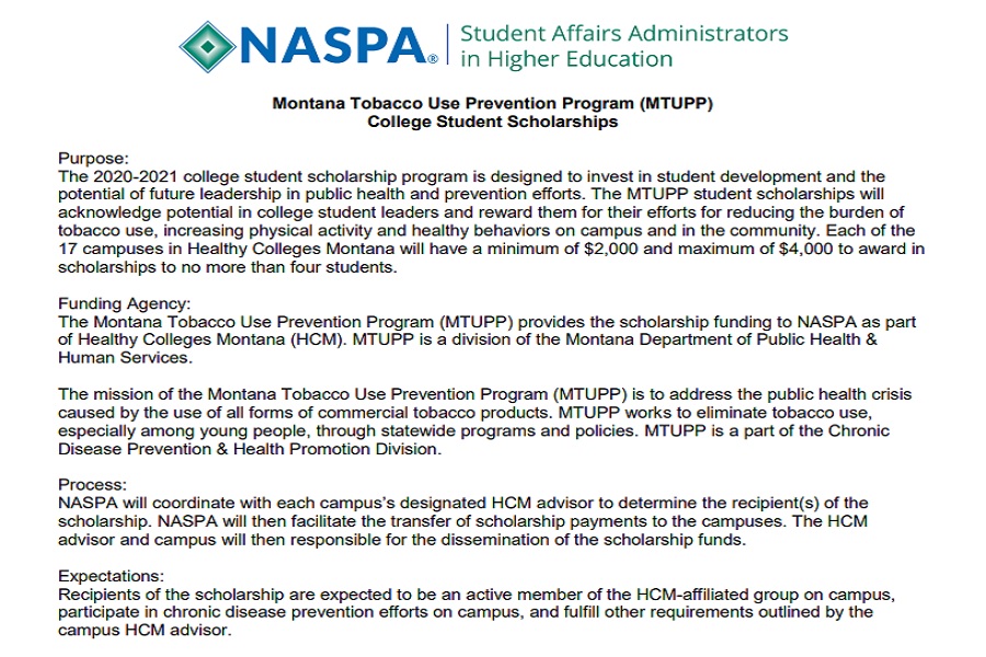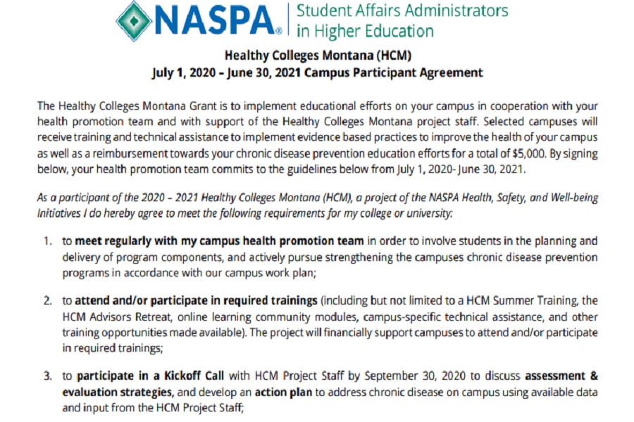 Healthy Colleges Montana is managed by the Health, Safety, and Well-being Initiatives team of NASPA. Please email [email protected] with any inquiries.